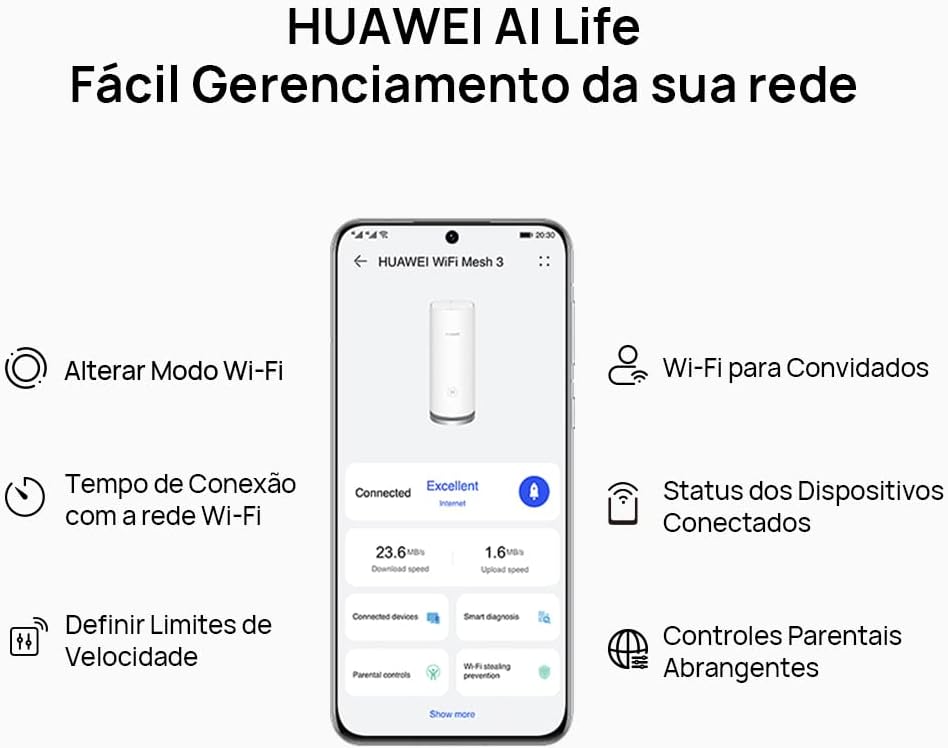 【Diagnóstico Inteligente】-Gerencie o Wi-Fi de toda a sua casa, detecte e resolva problemas de rede, tudo com apenas alguns toques em seu aplicativo HUAWEI AI Life. Visualize o status da rede em cada um dos dispositivos conectados em sua casa. Tenha uma percepção clara do status de sua rede doméstica.